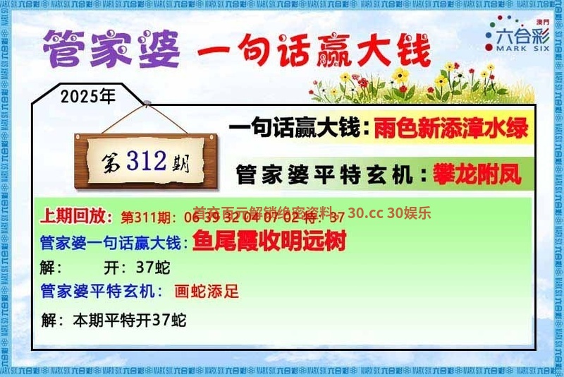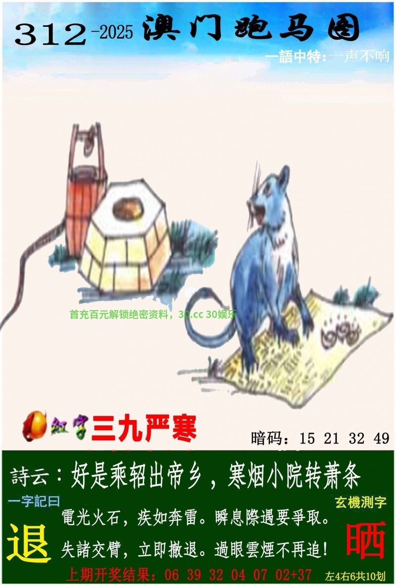312期一句话赢大钱╠雨色新添漳水绿╣ 解料:雨色新添漳水绿解绿波和雨肖的生肖猪、鼠、牛。 综合:虎兔马牛鼠龙 |